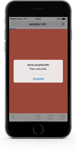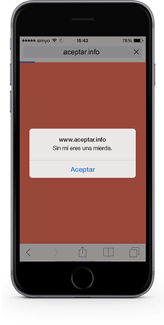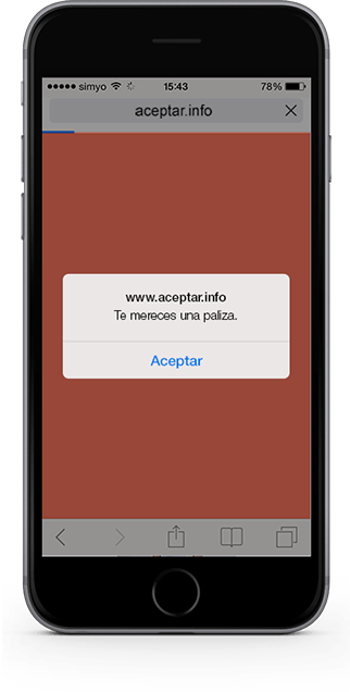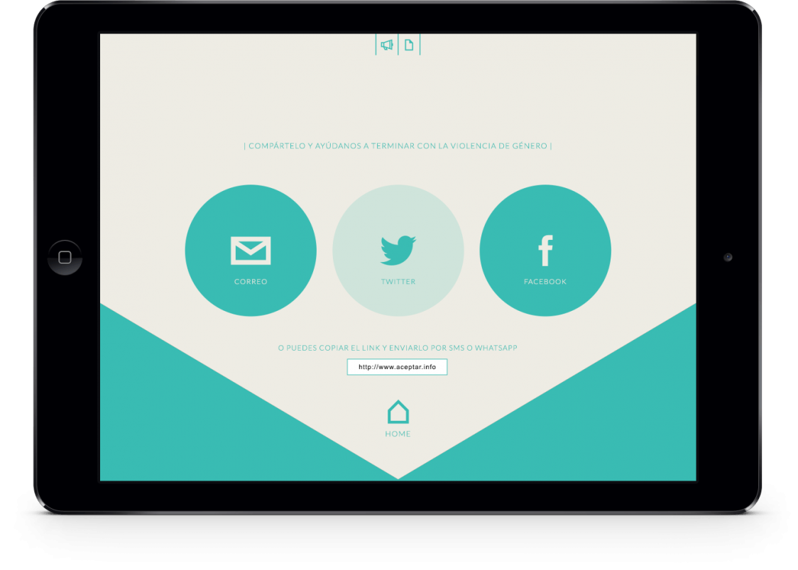 Queríamos concienciar a la sociedad del problema y para ello hicimos que lo vivieran en primera persona. Para ello, realizamos una pieza en la que el usuario se veía obligado a “aceptar” maltrato psicológico. ¿Cómo? enviamos de forma masiva un link que dejaba al usuario atrapado en su navegador. Para salir de esa situación, tenía que “aceptar” los mensajes de abuso y maltrato que le aparecían. Tras aceptar 12 mensajes vejatorios, aparecía una landing  page en la que asociábamos el sentimiento de frustración y abuso que estaba sufriendo con el de las mujeres maltratadas. Para moverlo en la red enviamos el típico mensaje viral con el link adjunto: “Millones de personas ya lo han vivido. No te lo pierdas, pincha aquí! www.aceptar.info” Y cada usuario al que llegaba, podía compartirlo con un simple clic en Facebook, Twitter, o por e-Mail. Además, se viralizó también mediante sms y whatsapp.