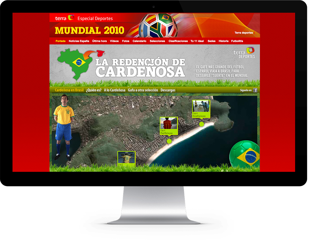 Using Julio Cardeñosa, a former player of the Spanish national team, famous for having missed an extremely easy goal during the Argentina 1978 World Cup. A miss that threw us out of that championship and made him the player with the worst luck in the history of the Spanish national soccer team. He was going to be the protagonist of the exclusive content we would generate for the Terra Sports website. The key to make the dream of every Spaniard come true: winning our very first Soccer World Cup. First we sent him to Brazil, the big favorite, so that he could spread all his bad luck to their fans, their symbols, their stadiums, their coach…everything. We created a website where people could follow his journey and win t-shirts to wear during Brazil’s games. And it worked. Brazil was eliminated in the quarterfinals.But we still had other tough adversaries to face. We then created a Facebook application to send bad luck to other national teams. We also sent Cardeñosa to the most important TV programs to accomplish his mission. And he did: we finally won our first soccer World Cup.