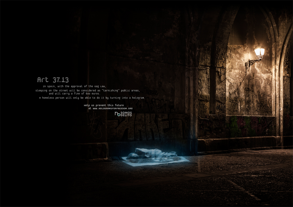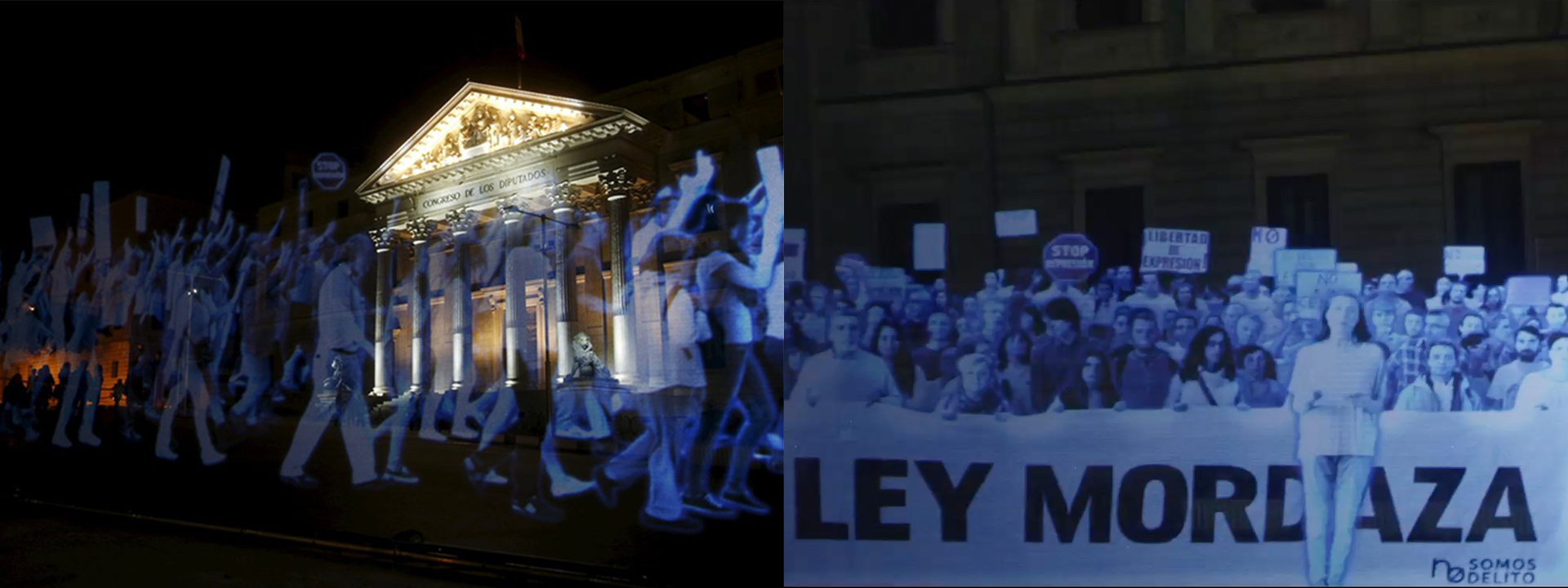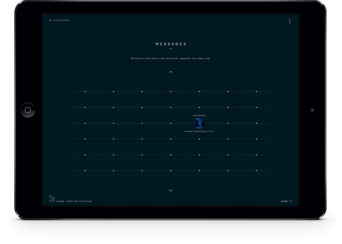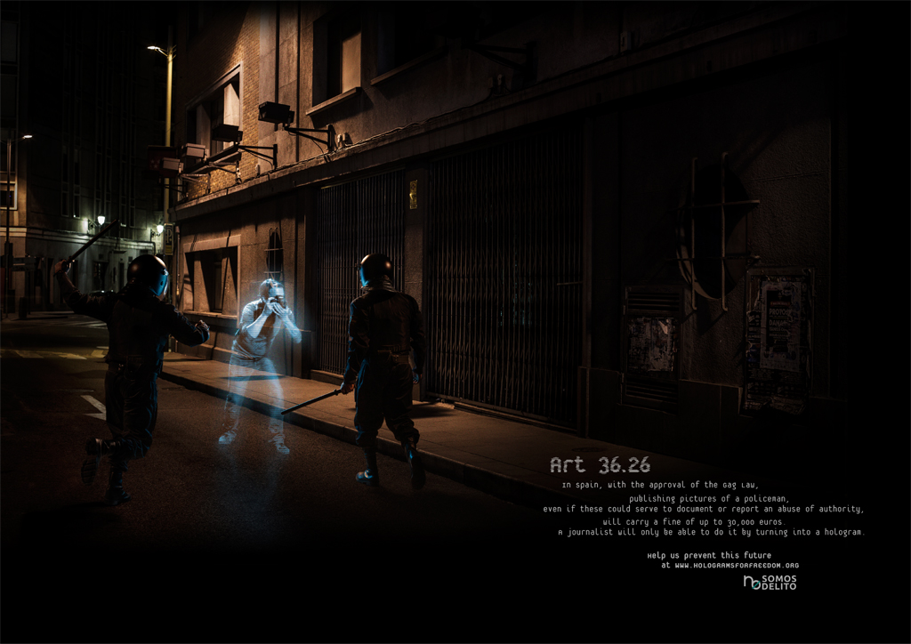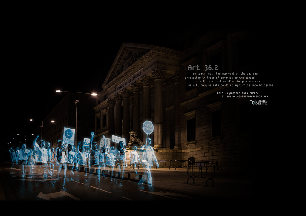 In order to get the law repealed, the citizens’ platform No Somos Delito (We Are Not Crime) wanted to show the entire world the future Spanish citizens will face if the law finally comes into effect on July 1, 2015. To do so, we organized the first Hologram Protest in history. During the two weeks prior to the protest, people from all over the world joined the demonstration by uploading their shouts, their proclamations, and their faces on the hologramsforfreedom.org website. They could also sign our petition on Avaaz.org, where we ask for the repeal of the law. On April 10, 2015, 17857 holograms protested in front of the Spanish Congress, demonstrating, that despite the trammels, they will never be able to silence the voice of the people.