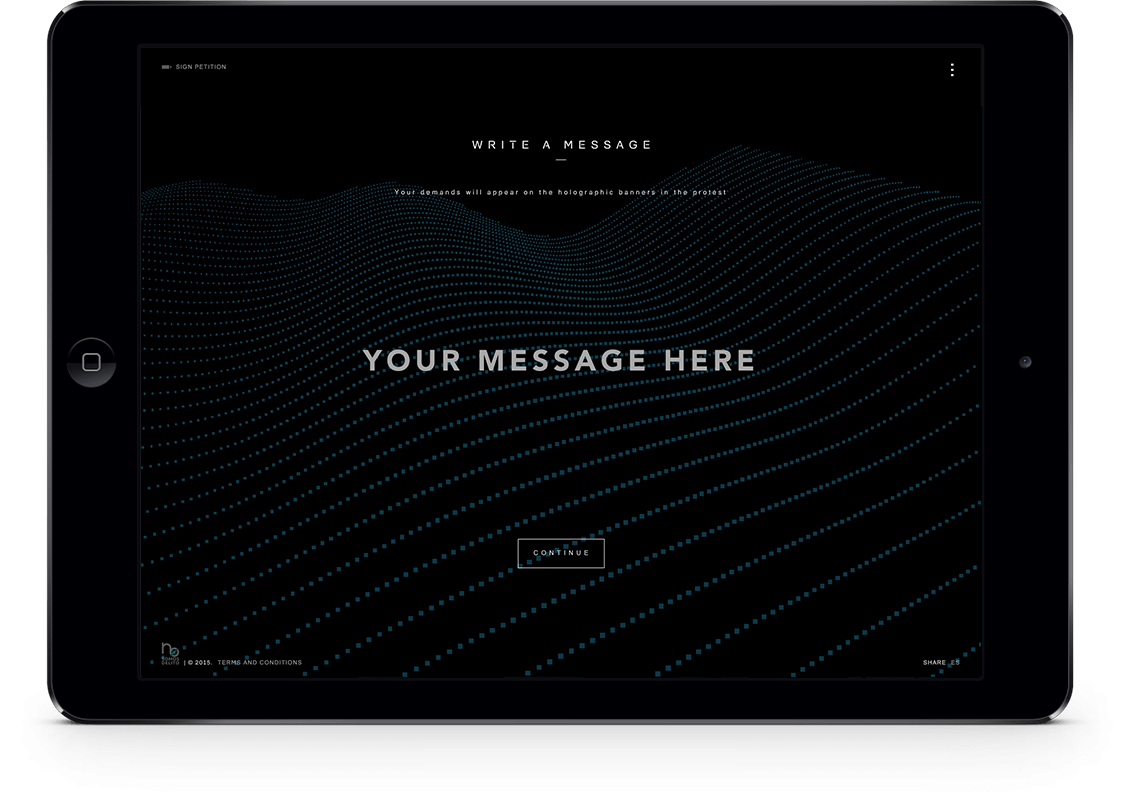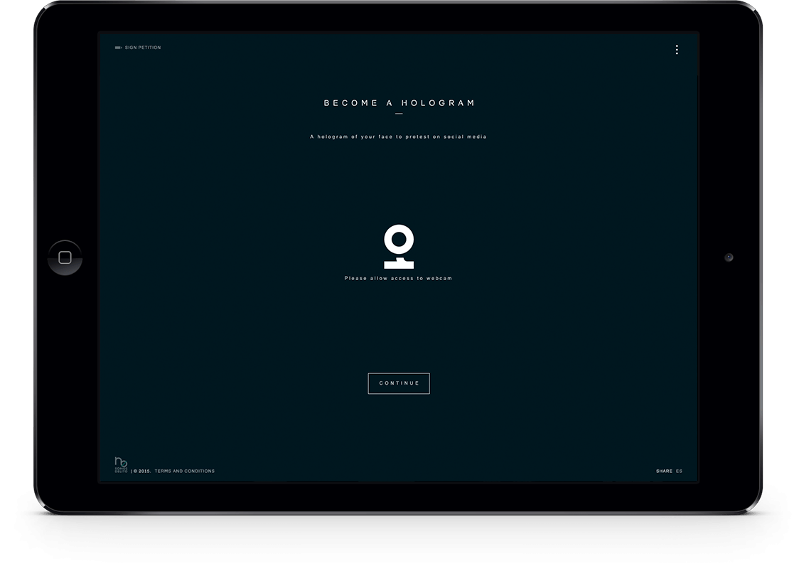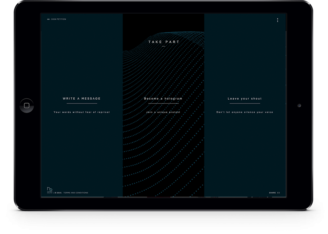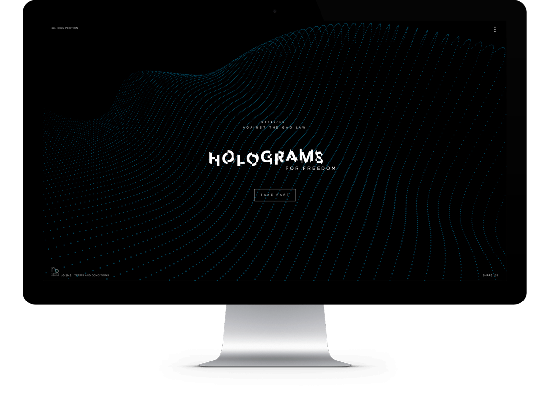 In order to get the law repealed, the citizens’ platform No Somos Delito (We Are Not Crime) wanted to show the entire world the future Spanish citizens will face if the law finally comes into effect on July 1, 2015. To do so, we organized the first Hologram Protest in history. During the two weeks prior to the protest, people from all over the world joined the demonstration by uploading their shouts, their proclamations, and their faces on the hologramsforfreedom.org website. They could also sign our petition on Avaaz.org, where we ask for the repeal of the law. On April 10, 2015, 17857 holograms protested in front of the Spanish Congress, demonstrating, that despite the trammels, they will never be able to silence the voice of the people.