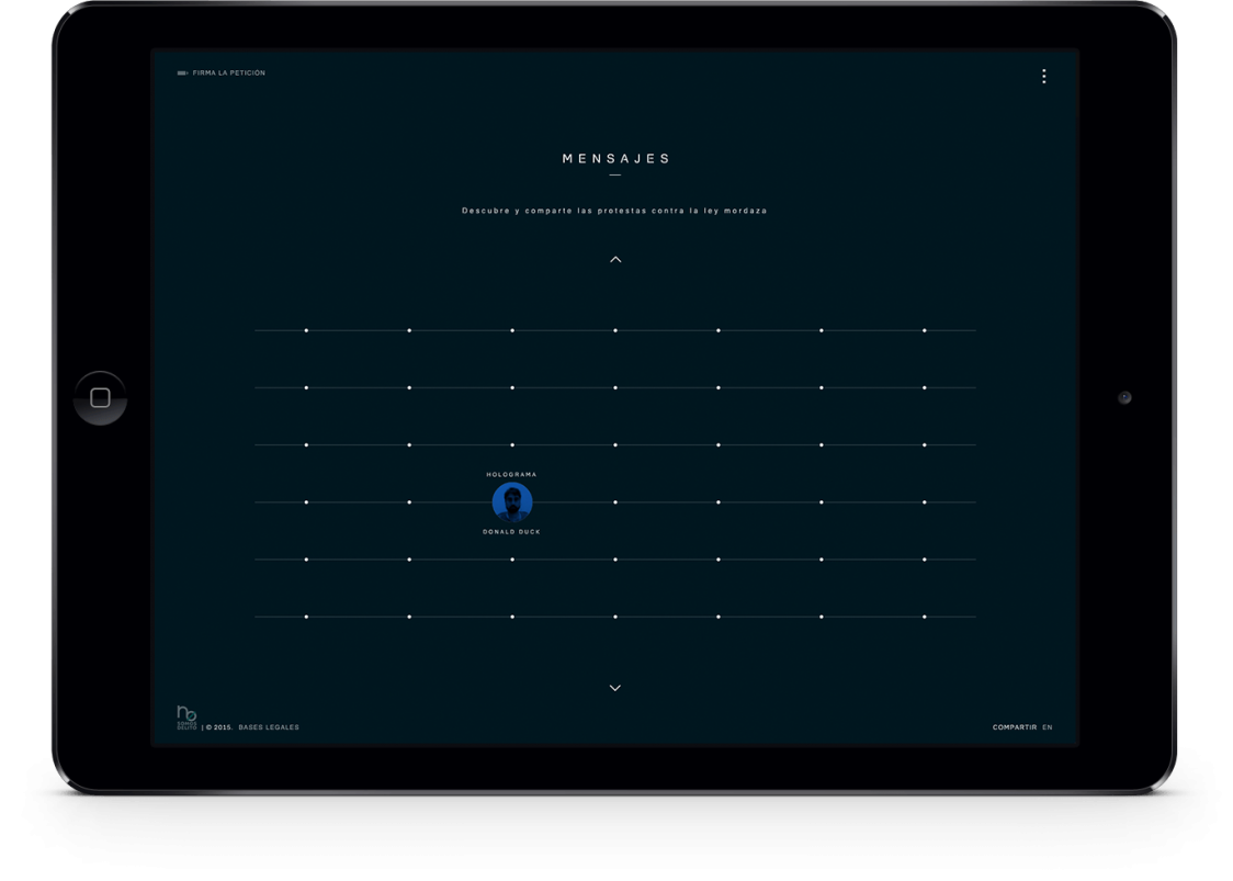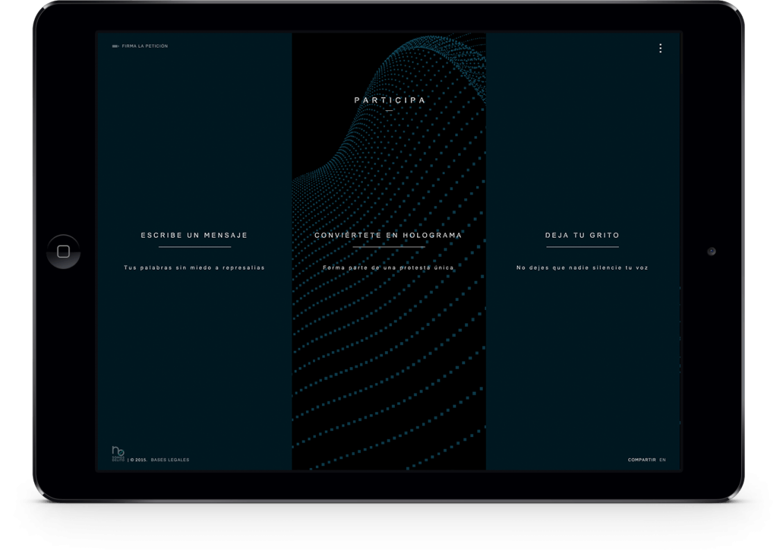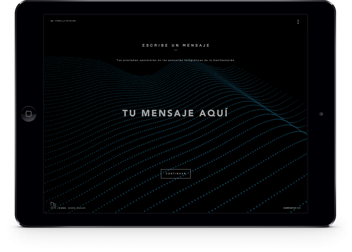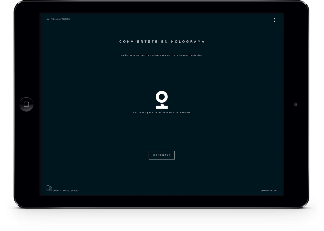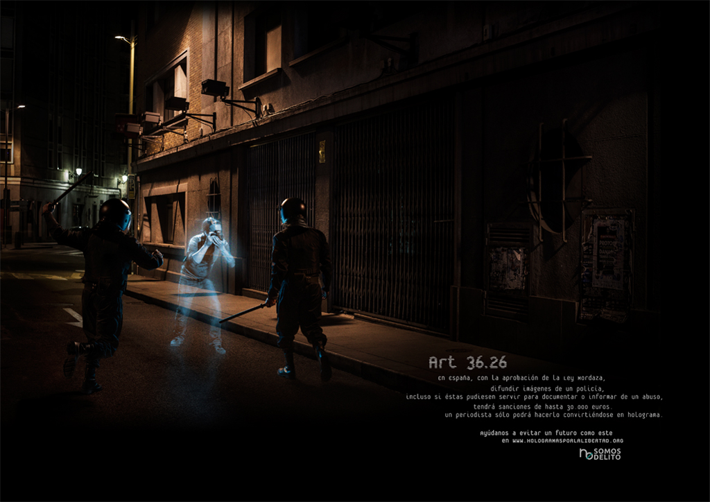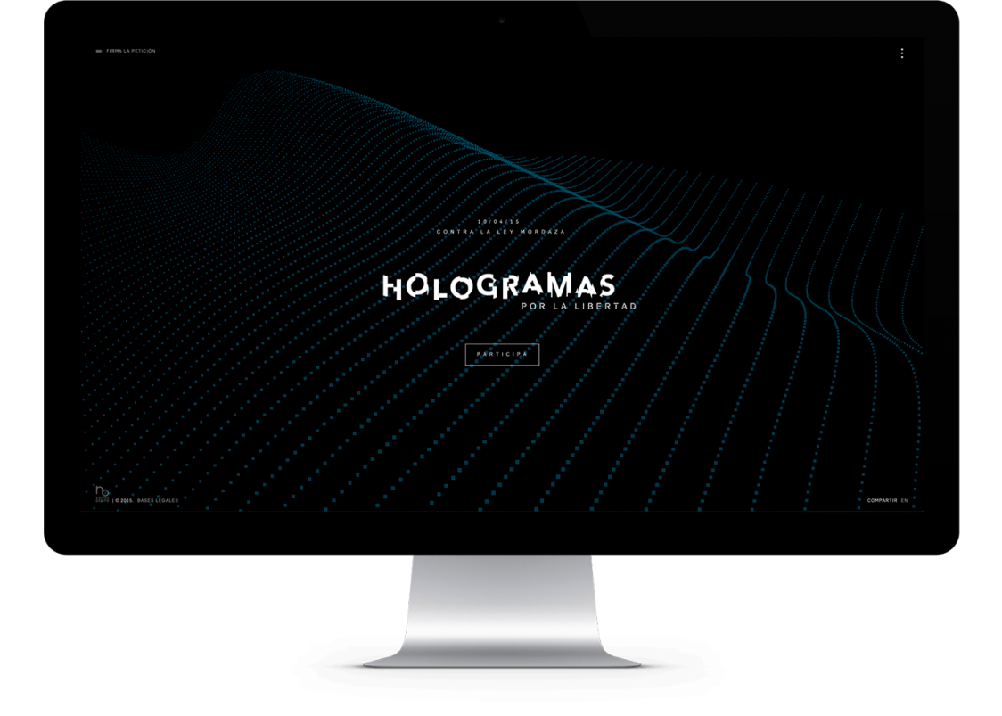 Para conseguir retirar la ley, la plataforma No Somos Delito quiso mostrarle al mundo entero el futuro al que se enfrentarán los ciudadanos en España si definitivamente la ley entra en vigor el 1 de julio de 2015. Para ello organizamos la primera manifestación de Hologramas de la historia. Durante las dos semanas previas a la protesta, personas de todo el mundo se unieron a la manifestación dejando sus gritos, sus proclamas y sus rostros en el website hologramasporlalibertad.org. Además, los usuarios podían firmar nuestra petición de Avaaz.org donde solicitamos la derogación de la ley. El 10 de abril de 2015, 17857 hologramas se manifestaron frente al Congreso, demostrando, que a pesar de las trabas, nunca podrán acallar las voces de la gente.