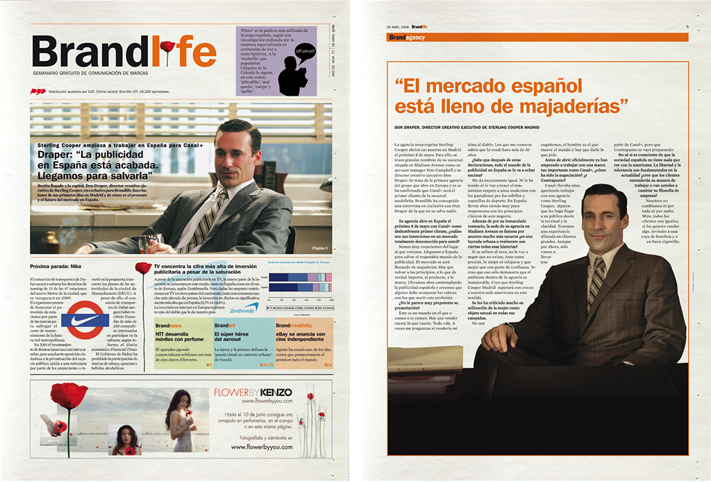 A large part of the advertising world in Spain believed Sterling Cooper was opening its agency in Madrid. We got hundred of messages on our answering machine asking for job interviews. Finally, on May 8th, Canal+ debut Mad Men and a large part of the industry got hooked thanks to this campaign.