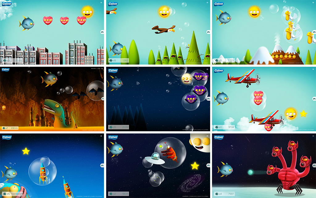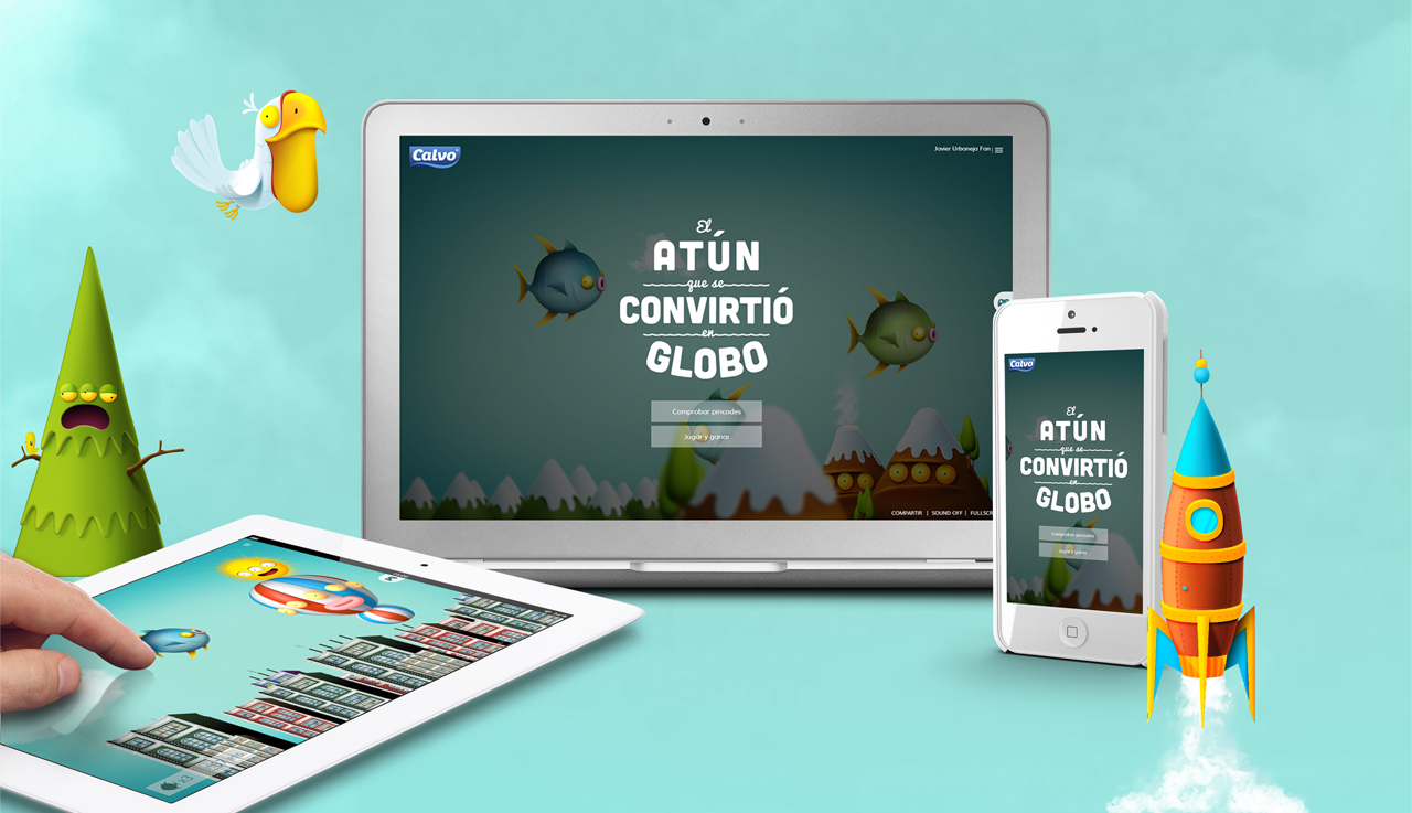 We decided to transform a simple promotion into an interactive content, fun and beautiful. To make that happen, we came up with a story: “Once upon a time a tuna fish swallowed a bunch of money, swelled up, and rose to the sky”. Thus “the tuna that turned into a balloon” was born, a shoot’em up game in which the user-controlled tuna ploughed through the skies. The users could choose a position on the map of Spain, and the more they got the tuna to advance in the game, the closer it got to their chosen position. The one with the tuna closest to his chosen position at the end of the countdown won a cash prize. The game must have been addictive, because once the initial promo ended, lots of people asked us to extend it. So, we created eight different levels, three types of firing modes, and a bunch of creatures hell-bent on making it harder for our balloon-tuna. There was also a hidden bonus level with extra lives. And of course, a final boss.